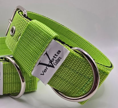 Stevige halsband in fel lime groen met stalen sluitwerk. De D ring is dichtgelast en kan niet openschieten, dus veilig voor een hond die veel kracht heeft of kan trekken. Oersterk en tijdloos!