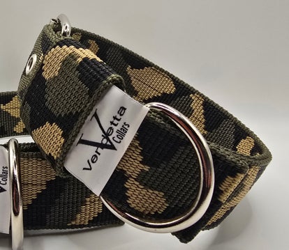 Stevige stoere halsband in een groene camoiflage kleur met stalen sluitwerk. De D ring is dichtgelast en kan niet openschieten, dus veilig voor een hond die veel kracht heeft of kan trekken. Oersterk en tijdloos!