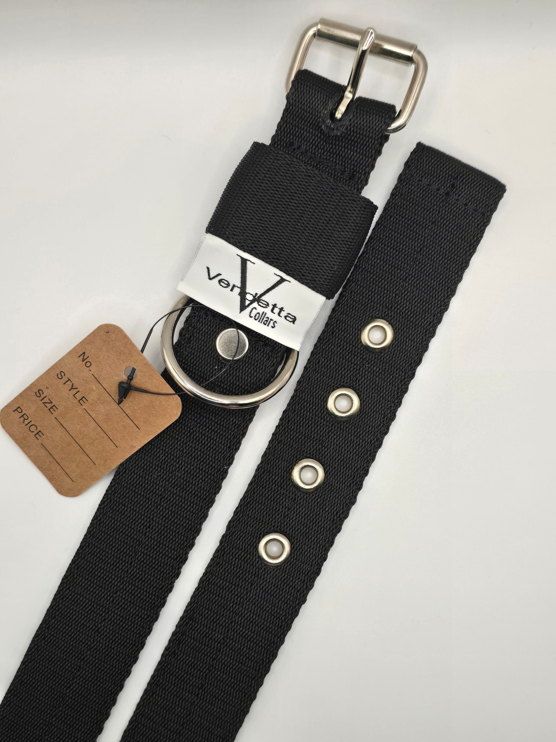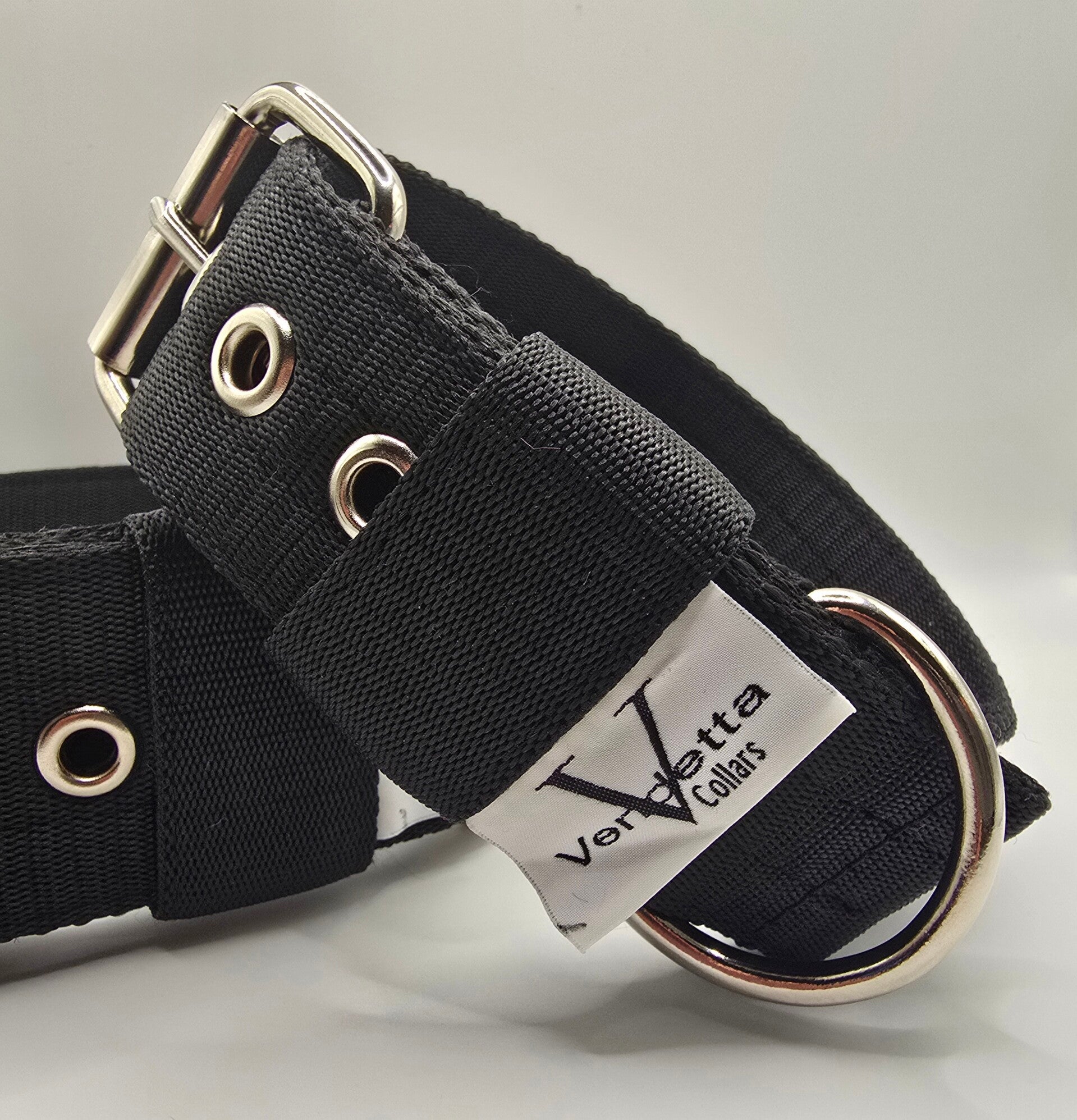 Stevige halsband in klassiek zwart met stalen sluitwerk. De D ring is dichtgelast en kan niet openschieten, dus veilig voor een hond die veel kracht heeft of kan trekken. Oersterk en tijdloos!