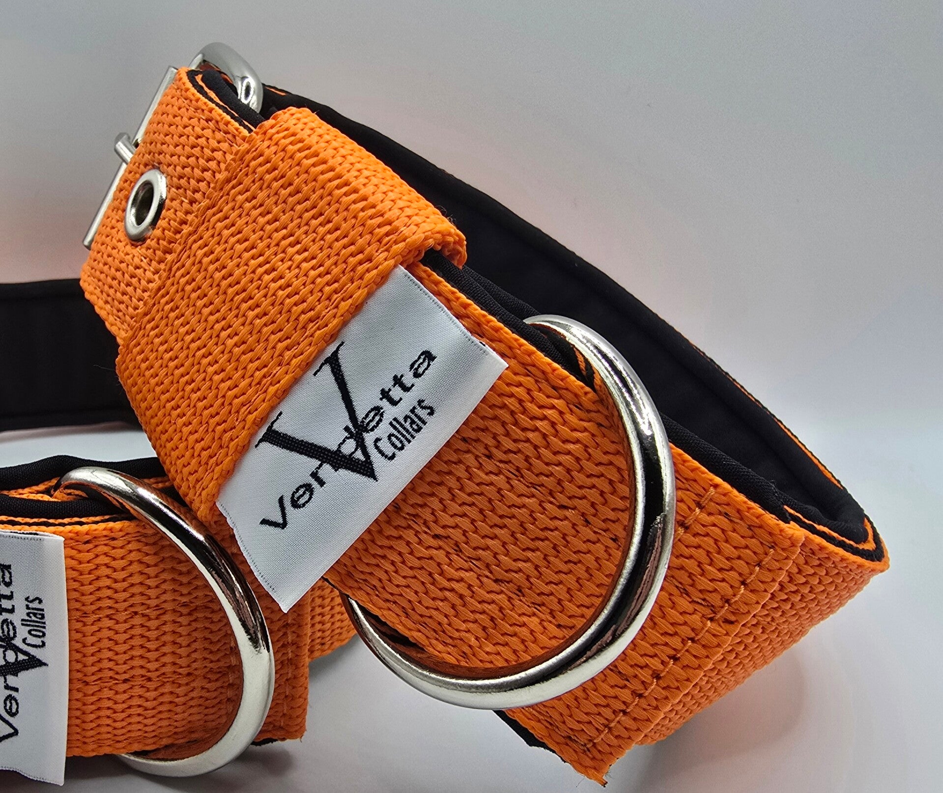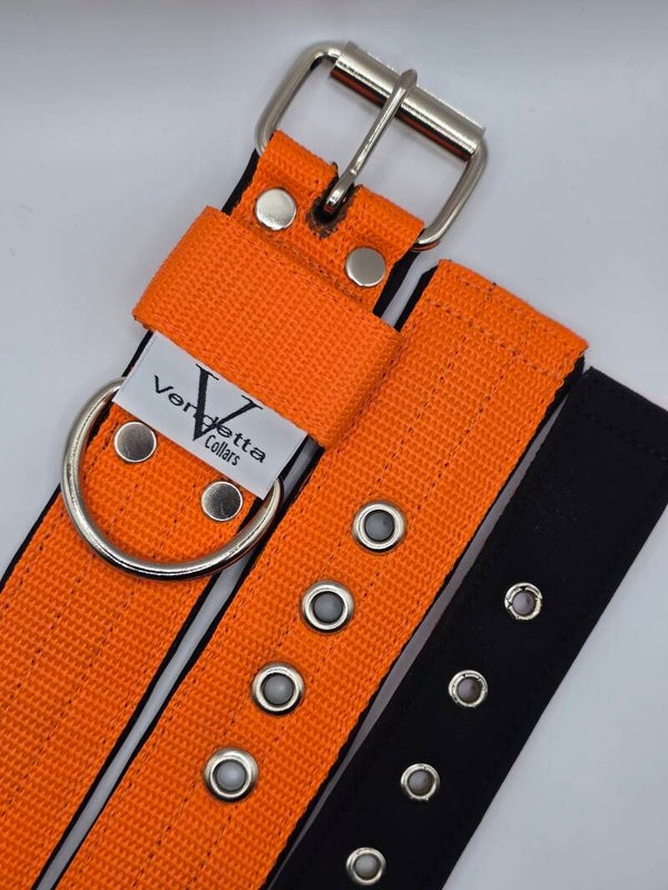 Stevige halsband in vrolijk oranje met een heerlijke comfortabele zwarte softhell voering en met stalen sluitwerk. De D ring is dichtgelast en kan niet openschieten, dus veilig voor een hond die veel kracht heeft of kan trekken. Oersterk en tijdloos!