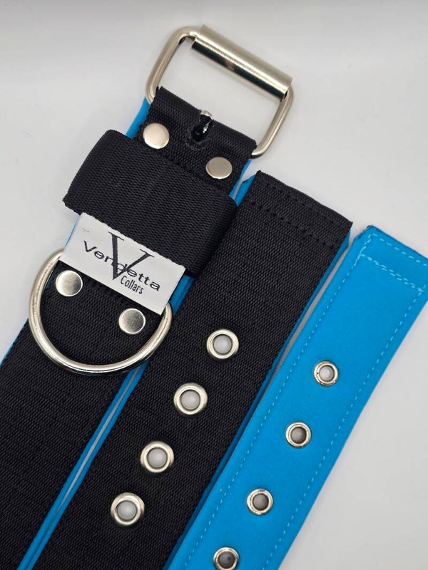 Stevige halsband in het zwart met een heerlijke comfortabele blauwe softhell voering en met stalen sluitwerk. De D ring is dichtgelast en kan niet openschieten, dus veilig voor een hond die veel kracht heeft of kan trekken. Oersterk en tijdloos!