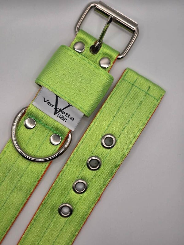 Sterk, stijlvol en verrassend comfortabel! Deze halsband, gemaakt van stevig autogordelmateriaal in groen met oranje, is bijna onverwoestbaar en toch soepel voor dagelijks draagcomfort. Kleurvast en slijtvast, dus hij blijft er lang als nieuw uitzien. Perfect voor honden die net zo krachtig zijn als hun uitstraling!