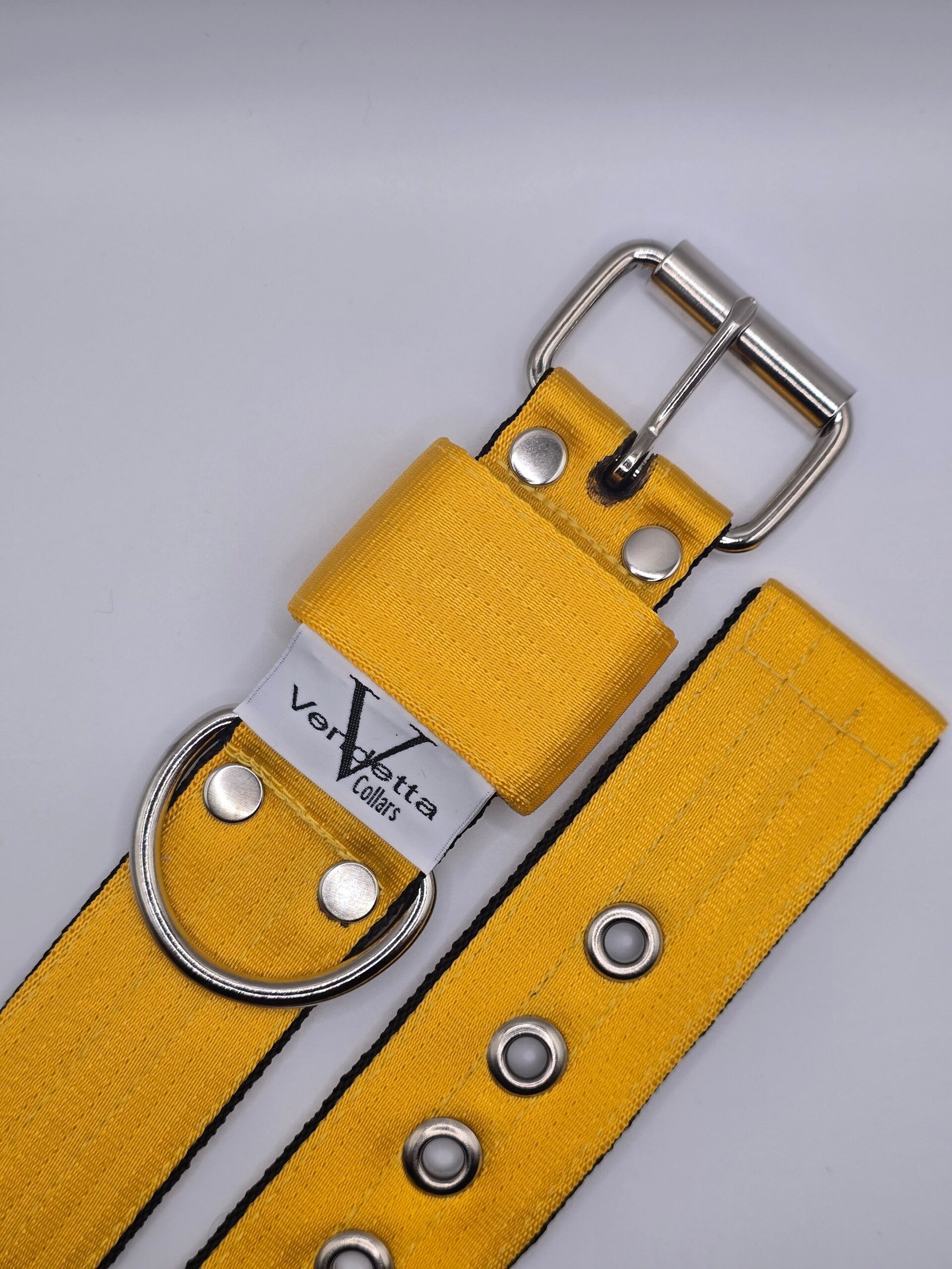 Sterk, stijlvol en verrassend comfortabel! Deze halsband, gemaakt van stevig autogordelmateriaal in geel met zwart, is bijna onverwoestbaar en toch soepel voor dagelijks draagcomfort. Kleurvast en slijtvast, dus hij blijft er lang als nieuw uitzien. Perfect voor honden die net zo krachtig zijn als hun uitstraling!