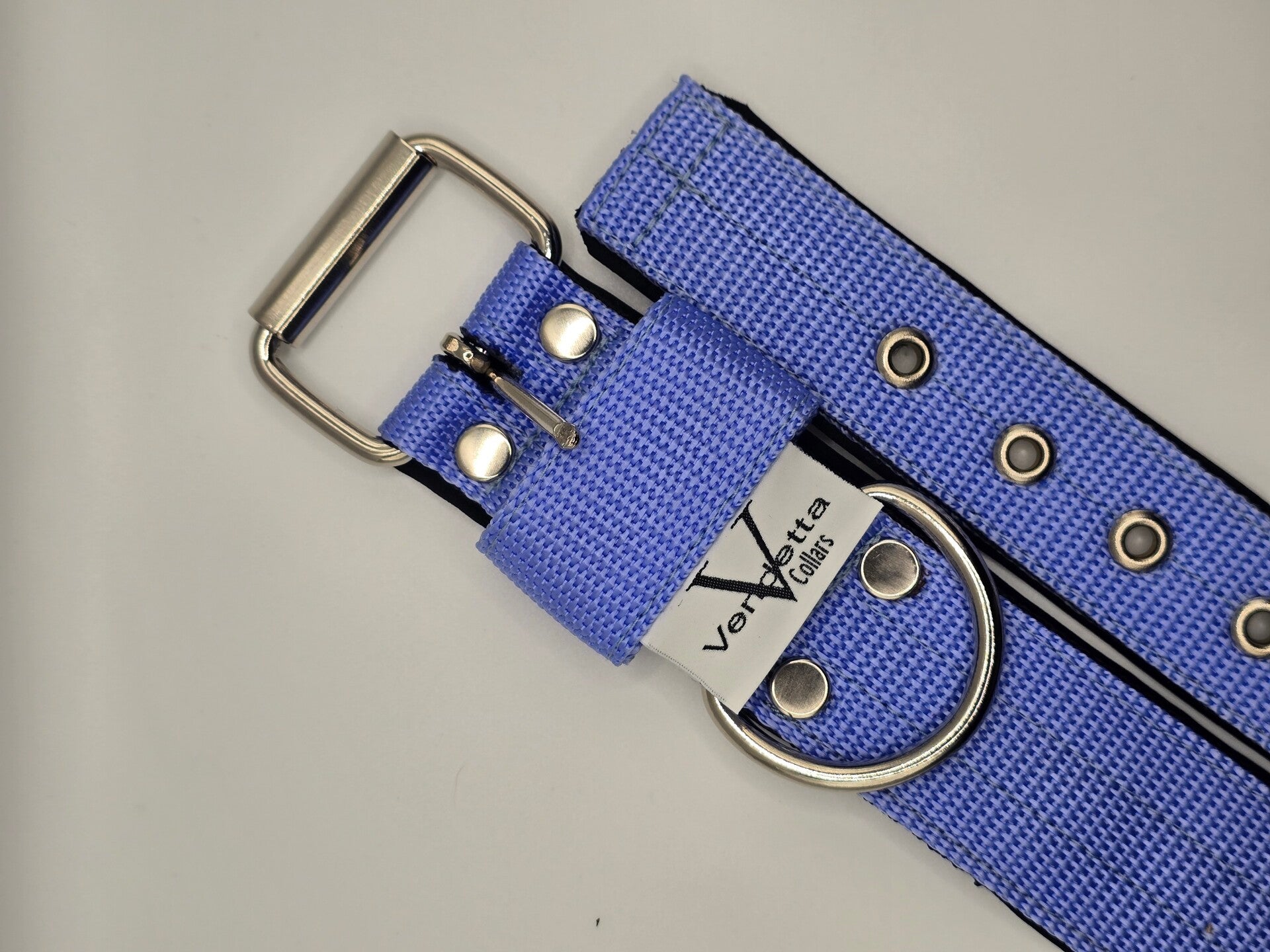 Stevige halsband in het zwart met een heerlijke comfortabele blauwe softhell voering en met stalen sluitwerk. De D ring is dichtgelast en kan niet openschieten, dus veilig voor een hond die veel kracht heeft of kan trekken. Oersterk en tijdloos!