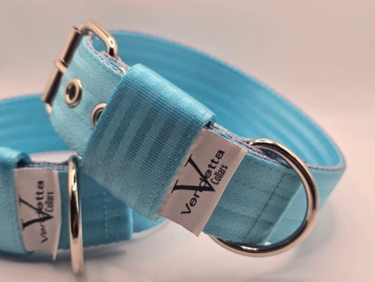 Sterk, stijlvol en verrassend comfortabel! Deze halsband, gemaakt van stevig autogordelmateriaal en helder turqouise, is bijna onverwoestbaar en toch soepel voor dagelijks draagcomfort. Kleurvast en slijtvast, dus hij blijft er lang als nieuw uitzien. Perfect voor honden die net zo krachtig zijn als hun uitstraling!
