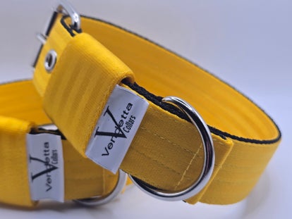 Sterk, stijlvol en verrassend comfortabel! Deze halsband, gemaakt van stevig autogordelmateriaal in geel met zwart, is bijna onverwoestbaar en toch soepel voor dagelijks draagcomfort. Kleurvast en slijtvast, dus hij blijft er lang als nieuw uitzien. Perfect voor honden die net zo krachtig zijn als hun uitstraling!