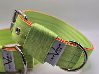 Sterk, stijlvol en verrassend comfortabel! Deze halsband, gemaakt van stevig autogordelmateriaal in groen met oranje, is bijna onverwoestbaar en toch soepel voor dagelijks draagcomfort. Kleurvast en slijtvast, dus hij blijft er lang als nieuw uitzien. Perfect voor honden die net zo krachtig zijn als hun uitstraling!